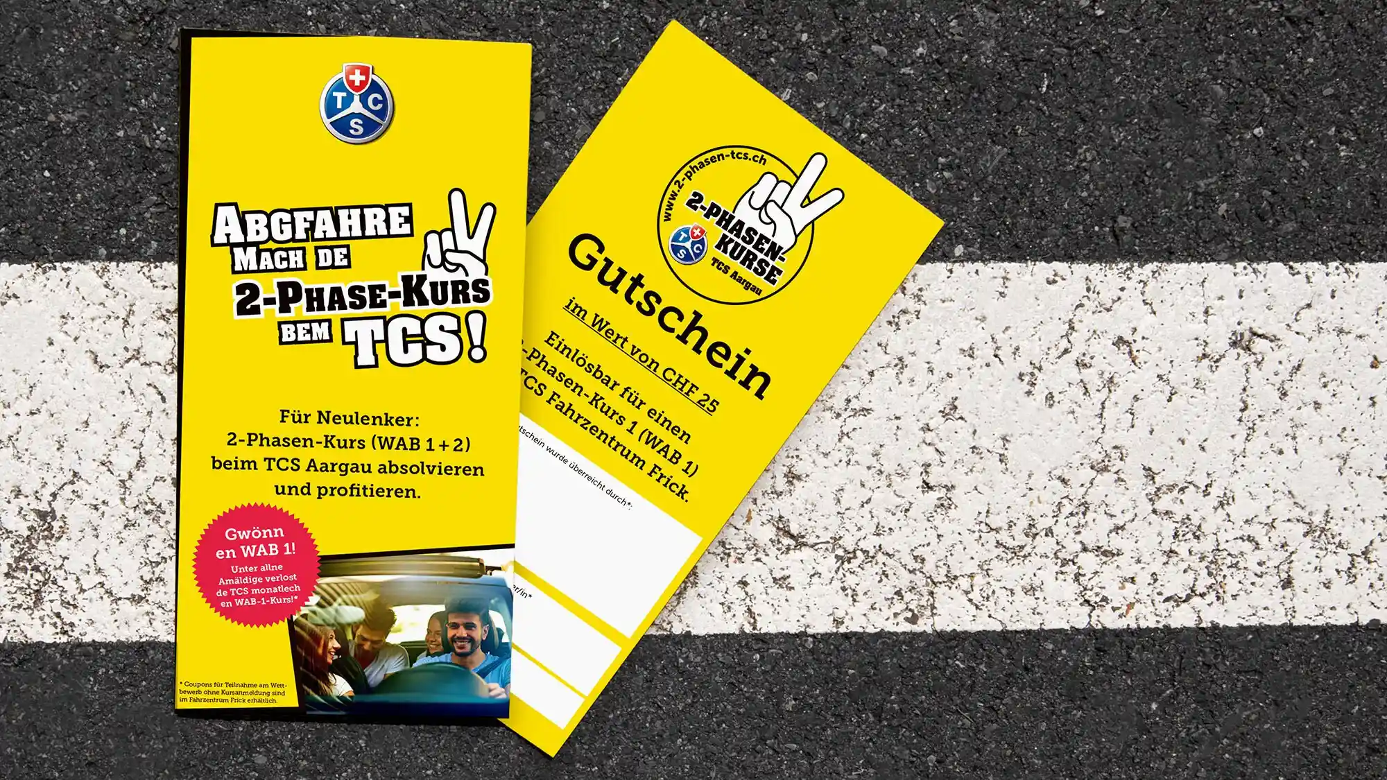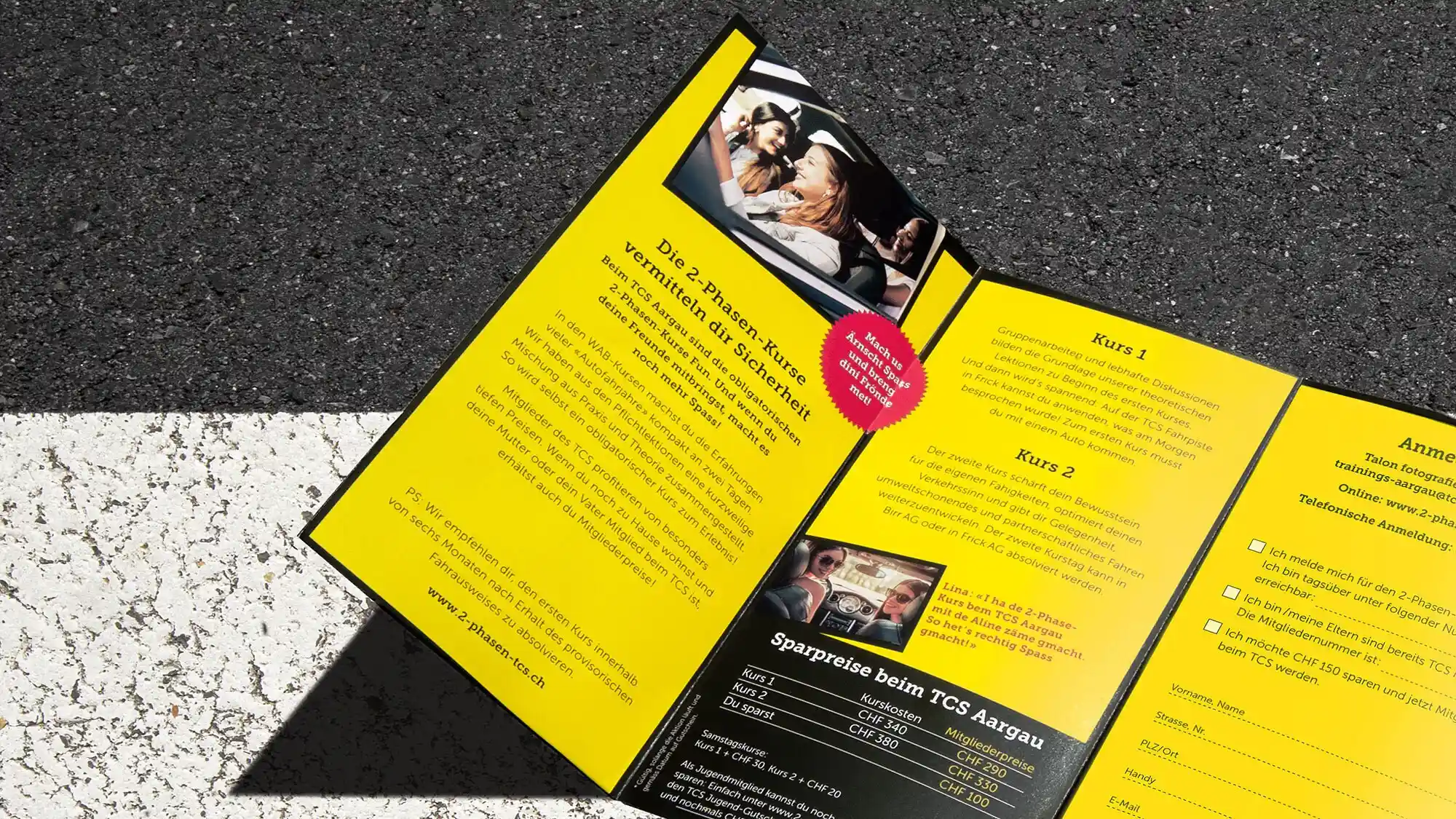 Die zweite Binsenwahrheit über die Generation Z ist, dass sie eben doch nicht nur online ist. Zwischendurch taucht sie im echten Leben auf. Um sie auch dort abzuholen, wird die Onlinekampagne mit einer Plakatkampagne und Flyern ergänzt. Die Plakate erinnern die Neulenker an Bahnhöfen und Schulen im Kanton Aargau und im angrenzenden Basel-Land daran, wie cool es ist, den 2-Phasen-Kurs beim TCS zu absolvieren. Die Kurse finden im Fahrzentrum Frick statt – für Baselländer Neulenker super erreichbar. Die Flyer sind für die Fahrlehrer, die sie ihren Fahrschülerinnen und Fahrschülern verteilen. Wenn es jetzt noch einen Neulenker gibt, der die 2-Phasen-Kurse im Fahrzentrum Frick nicht kennt, muss er aus dem Tessin kommen. Die vollen Kurse in Frick deuten zumindest darauf hin.
